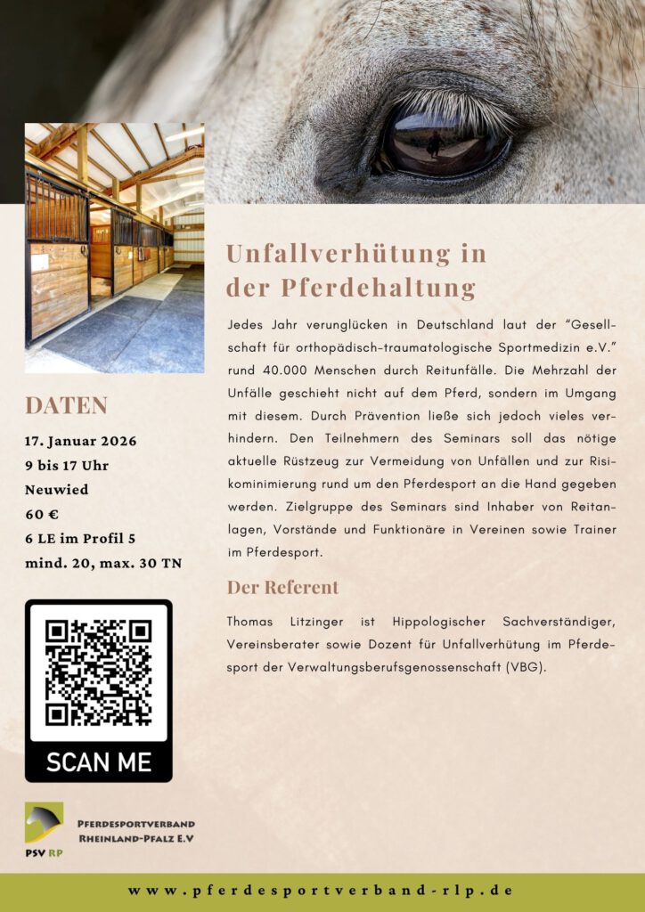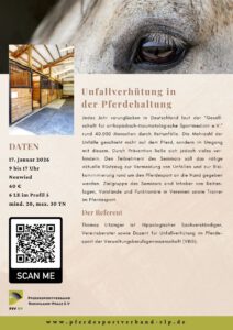 Jedes Jahr verunglücken in Deutschland laut der “Gesellschaft für orthopädisch-traumatologische Sportmedizin e.V.” rund 40.000 Menschen durch Reitunfälle. Die Mehrzahl der Unfälle geschieht nicht auf dem Pferd, sondern im Umgang mit diesem. Durch Prävention ließe sich jedoch vieles verhindern. Den Teilnehmern des Seminars soll das nötige aktuelle Rüstzeug zur Vermeidung von Unfällen und zur Risikominimierung rund um den Pferdesport an die Hand gegeben werden. Zielgruppe des Seminars sind Inhaber von Reitanlagen, Vorstände und Funktionäre in Vereinen sowie Trainer im Pferdesport.