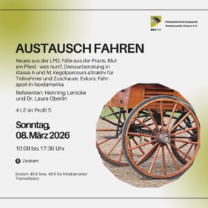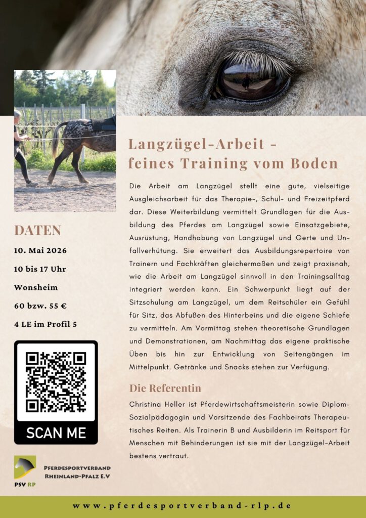 Die Arbeit am Langzügel stellt eine gute, vielseitige Ausgleichsarbeit für das Therapie-, Schul- und Freizeitpferd dar. Diese Weiterbildung vermittelt Grundlagen für die Ausbildung des Pferdes am Langzügel sowie Einsatzgebiete, Ausrüstung, Handhabung von Langzügel und Gerte und Unfallverhütung. Sie erweitert das Ausbildungsrepertoire von Trainern und Fachkräften gleichermaßen und zeigt praxisnah, wie die Arbeit am Langzügel sinnvoll in den Trainingsalltag integriert werden kann. Ein Schwerpunkt liegt auf der Sitzschulung am Langzügel, um dem Reitschüler ein Gefühl für Sitz, das Abfußen des Hinterbeins und die eigene Schiefe zu vermitteln. Am Vormittag stehen theoretische Grundlagen und Demonstrationen, am Nachmittag das eigene praktische Üben bis hin zur Entwicklung von Seitengängen im Mittelpunkt. Getränke und Snacks stehen zur Verfügung.